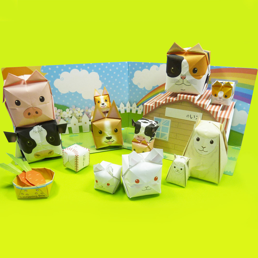 可以根据折法手册的步骤图折出花猫妈妈和花猫宝宝,柴犬妈妈和柴犬宝宝、绵羊爸爸和绵羊宝宝、兔子爸爸和兔子宝宝,奶牛妈妈和奶牛宝宝,猪爸爸和猪宝宝,还有它们的大餐——胡萝卜,和玩具——棒球。